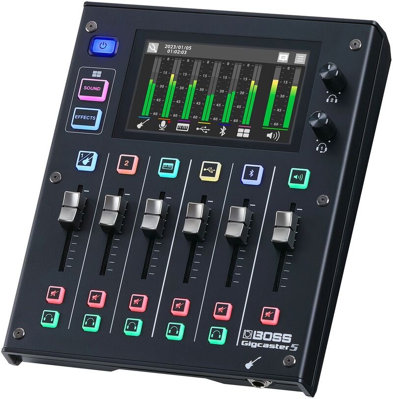 Femkanals strømmingsmikser med gitar/bass-inngang, to XLR mikrofoninnganger, stereo linjeinngang, åtte lyd-/effektpader på skjermen, med mer.