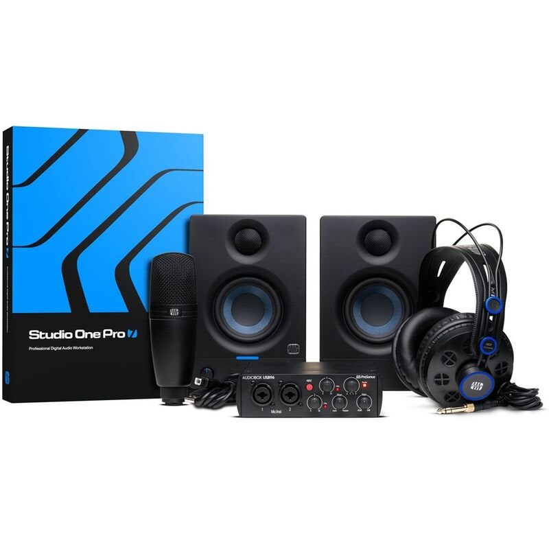 Pakken inneholder også Eris 3.5-studiomonitorer med justerbar akustikk, HD7-høretelefoner for overvåkning og M7 MKII-kondensatormikrofon med tilbehør. En 6-måneders lisens for Studio One Pro følger med, som gir tilgang til et komplett DAW-program. Alle nødvendige kabler følger med for en rask oppstart.