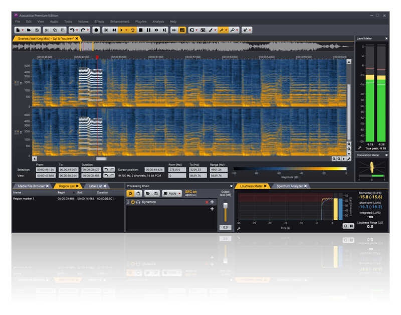 Premium Edition legge til avanserte funksjoner som spektralredigering med kraftige retusjalgoritmer og støtte for flerkanals lyd opptil 7.1 surround. Et stort utvalg av plug-ins er inkludert og sømløst integrert i applikasjonen. Med Premium Edition kan du også bruke disse i andre vertsapplikasjoner som støtter VST, VST3, AAX eller Audio Units (Mac bare):