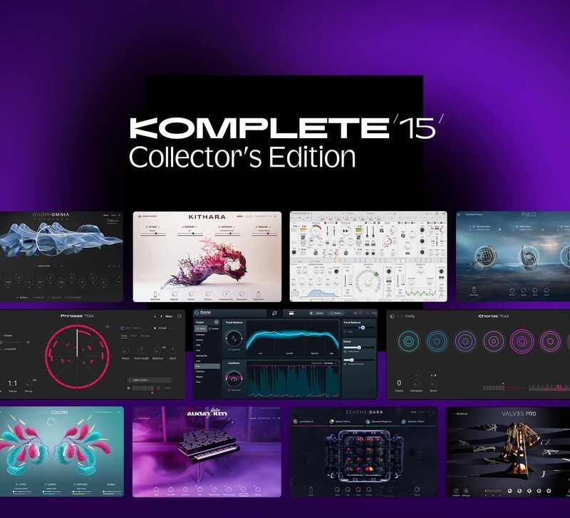 Komplete 15 Collector’s Edition inkluderer Kontakt 8 med nye intelligente verktøy og Leap-funksjoner, Guitar Rig 7 Pro, iZotope Ozone 11 Standard, Kithara, Fables, Action Woodwinds, Valves Pro, og mange flere.
