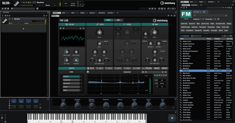 I FM Lab finnes et komplett åtteoperatørs FM-instrument med et stort utvalg forhåndsinnstillinger. Instrumentet Tales bygger på gitarlydder der hver strøng har separate samplings som øpne toner og stemt om, noe som gir et rent grunnlyd supplert med synt- og akustiske lag.