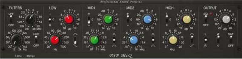 PSP McQ fanger den Sonic karakteren og funksjonaliteten til ulike klassiske konsollequalizere som de allsidige MCI konsoll-EQ-ene. Men, mens PSP McQ var inspirert av disse analoge klassikerne, la vi til flere moderne funksjoner som justerbare høypass- og lavpassfiltre, filter-tynne (resonans) kontrollere for hyllesfiltrene, valgfri klokkefiltre for lav- og høybåndene, samt tre nominelle Q-verdier for midtlydfiltrene.