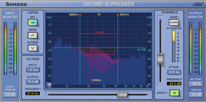 Artikkelnummer 1018268Oxford SuprEsser er en høyt utstyrt profesjonell De-Esser og en Dynamic EQ. Den har en enkel modus for raske justeringer, men også en avansert modus for økt funksjonalitet og finjustering. Kombinasjonen av en intuitiv FFT-visning og tre lyttemoduser gjør det enkelt å se og høre akkurat hvor problemfrekvensene er, noe som gjør det mulig å raskt redusere eller fjerne den plagsomme lyden. I tillegg til å kunne utløse fullbåndskomprimering, kan de skadelige frekvensene nøye skjæres ut. Siden SuprEsser kan operere på alle frekvenser, kan 'plosiver' og andre irritasjoner også fjernes uten anstrengelse, noe som gjør den til mer enn bare en enkel De-Esser. Ekstra funksjoner inkluderer Automatic Level Tracking, Linear Phase Filtering og en Wet/Dry-blandingskontroll for endelig balansering.