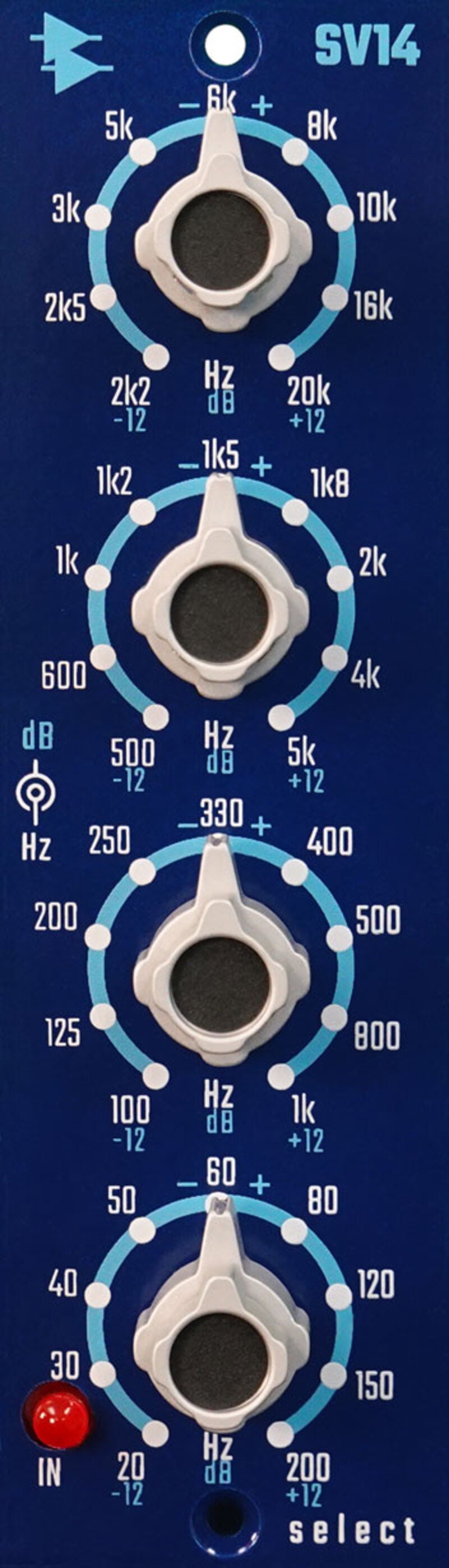 API Select SV14 EQ-kretsdesignet har røtter i API's historie. Trofast rekonstruert fra de svært ettertraktede APSI 562 EQ'ene, som ble distribuert av API på 1970- og 1980-tallet, tilbyr SV14 parametrisk equalization til en overkommelig pris. SV14 har også en EQ inn/ut-bryter, transformerbalansert utgang og doble konsentriske knapper som gir kontinuerlig justerbar kontroll av forsterkning/skjæring og frekvensvalg.