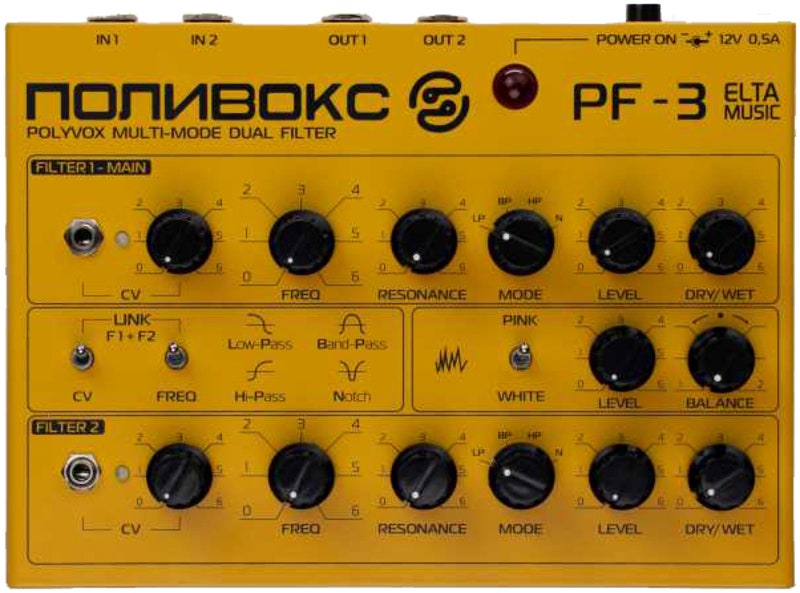 PF-3 mk.2 er en stereo analog filter med fire ulike filtermoduser: lowpass, bandpass, highpass og notch. Disse er tilgjengelige på begge kanaler, det er en stereo-prosessor. Du kan koble begge filtre sammen med en bryter slik at du kan styre to filtre og CV samtidig med ett enkelt knapper.