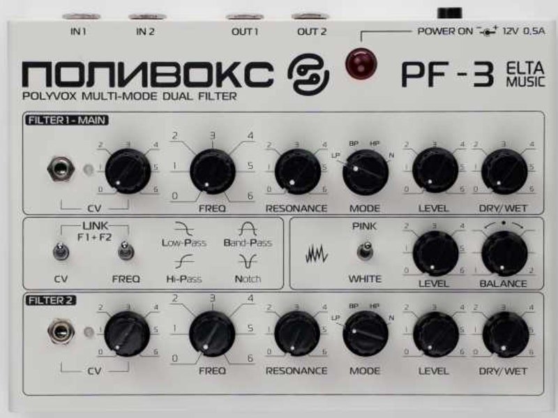 PF-3 mk.2 er et stereo analogt filter med fire forskjellige filtermodus ombord: lowpass, bandpass, highpass og notch. Disse er tilgjengelige på begge kanaler, det er en stereo-prosessor. Du kan koble begge filtre med en bryter slik at du kan kontrollere to filtre og CV samtidig med et enkelt potentiometer.