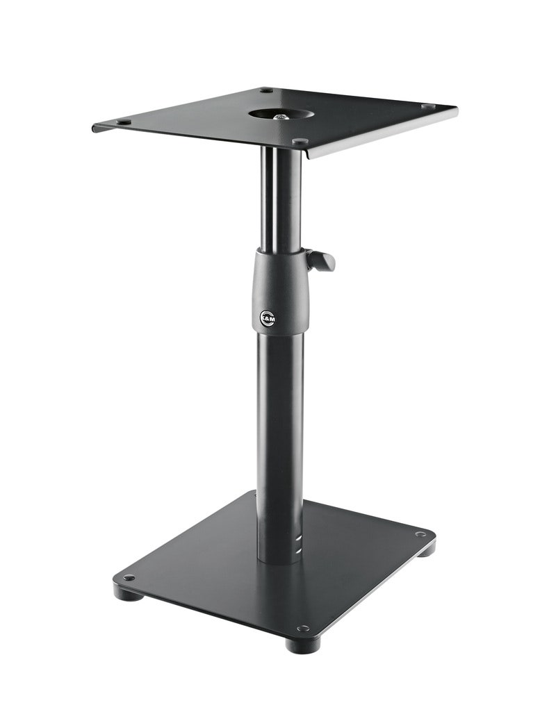 Høyderegulerbar deskstand for near-field monitorer. Den solide metallkonstruksjonen med den store støtteplaten (205 x 245 mm) er egnet for et bredt utvalg av monitorer og annet utstyr i samme størrelsesorden. Fire filtbelagte støttemuffer gir avkobling under bunnplaten. Den individuelle høyden kan justeres i 6 trinn mellom 350 og 500 mm. Når det gjelder bæreevne, kan standen sentreres belastet opp til 25 kg. Gummiputer er inkludert for sikker, støydempende støtte av monitorene.