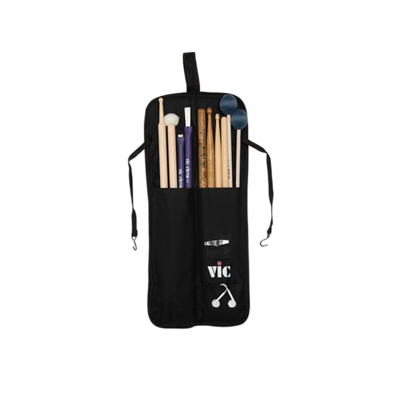 Designed to hold 4-5 implements. Features a hook-and-strap system for hanging, internal pocket and elastic drum key loop.