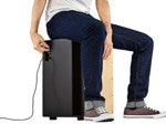 Subwoofer Pickup Cajon med kropp/sider utav svart ecovänlig fiberboard, frontplatta i björk med unike lydhull/port ved siden av cajonen i stedet for det tradisjonelle lydhullet på baksiden av cajonen.