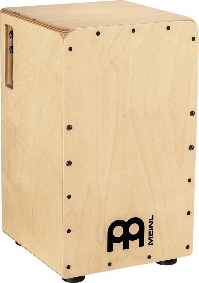 Meinl Woodcraft cajon i björk og med frontplatte av björk-laminat. Spesielt utformede innebygde sejarstenger, montert bak frontplaten.