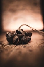 Pangi Seed Nutshells/Pangifrø-nøttskall, festet i et snøre. Skaper et unikt og kult lyd, allsidig instrument som kan bæres rundt ankelen eller holdes i hånden.