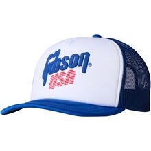Truckercaps, hvit/blå, Gibson USA-logo, justerbar voksenstørrelse, pustende mesh, retro Gibson-stil